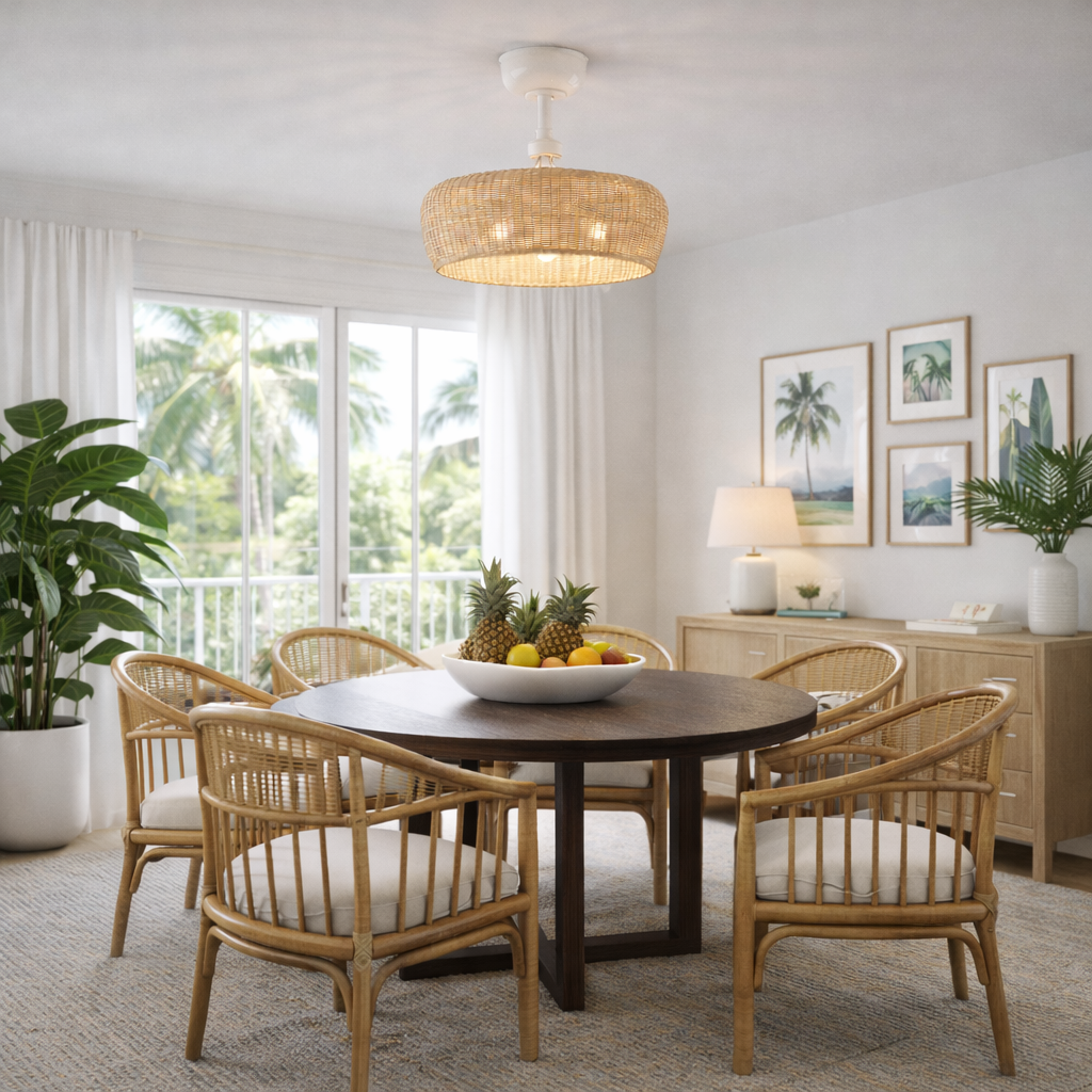 Rattan is a natural fibrous material that is hand-woven and can have imperfections and inconsistencies. Sometimes rattan can have small splits, and these are not considered defects. Direct sunlight can affect the color, so it is recommended to keep it out of direct sunlight. For this reason, this fan is designed for indoor use only. Rattan naturally will darken in color over time.
