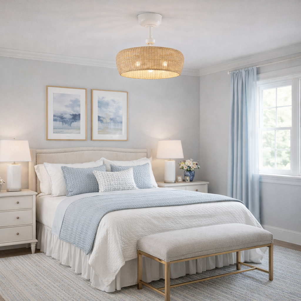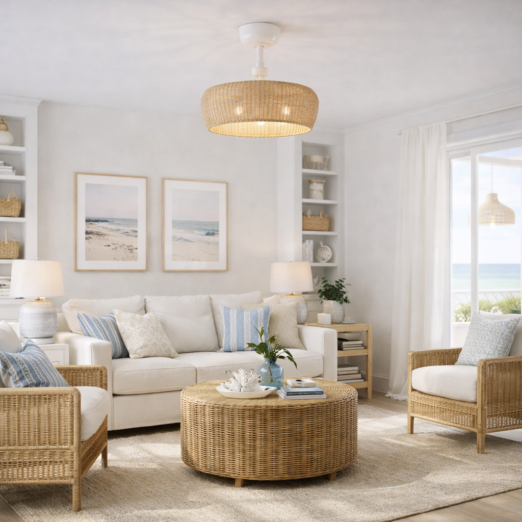 The Maribel®™ Ceiling Fan in Matte White finish with Natural Shade adds a touch of the outdoors, and a cooling breeze to any room. The natural lines of the woven rattan shade provides an earthy presence, and the white painted steel frame provides a soft comfortable feel to any room. This fan with lights is very versatile, and is ideal for use in medium to small sized rooms, like bedrooms, bathrooms, kitchens, laundry rooms, dens, and offices. The ideal room size for this fan is between 100-130 square feet.