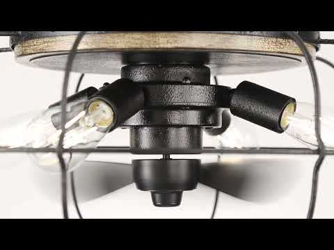 A 22 inch flush mount ceiling fan fandelier with a satin black finish and faux woodgrain accents, featuring a cage design with LED lights and remote