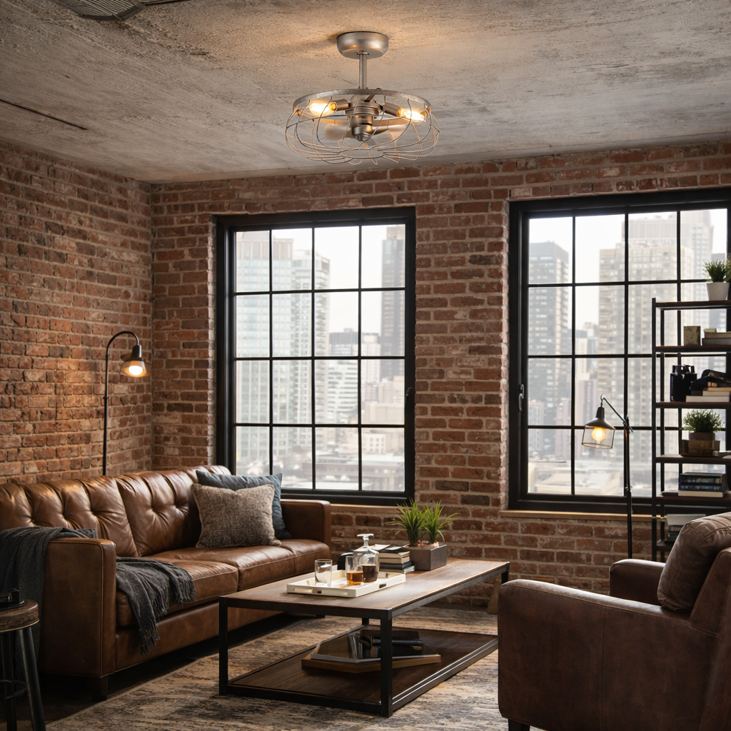 The Santiago® Ceiling Fan in Galvanized finish adds warmth, charm, and a cooling breeze to any room in your home or office. The unique retro look of the steel cage design, is combined with air circulation and dimmable light performance. This fixture is ideal for rooms between 100-130 square feet. The included 6-inch downrod is ideal for use on 9 ft ceilings. Other downrod lengths are available depending on your ceiling height.